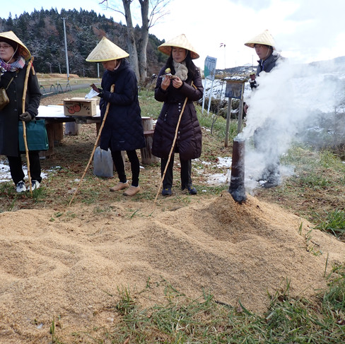 清掃の後は焼き芋の時間です。予定では落ち葉で焼き芋体験でしたが、前日からの雪で落ち葉が濡れてしまったので、もみ殻を使って焼きました。焼き芋の場所は”馬冷し場”です。ここは川沿いにあり、かつて馬に水を飲ませたり体を冷やすところで、広場のようになっています。みなさんで焼き芋を頬張りながら一息です。